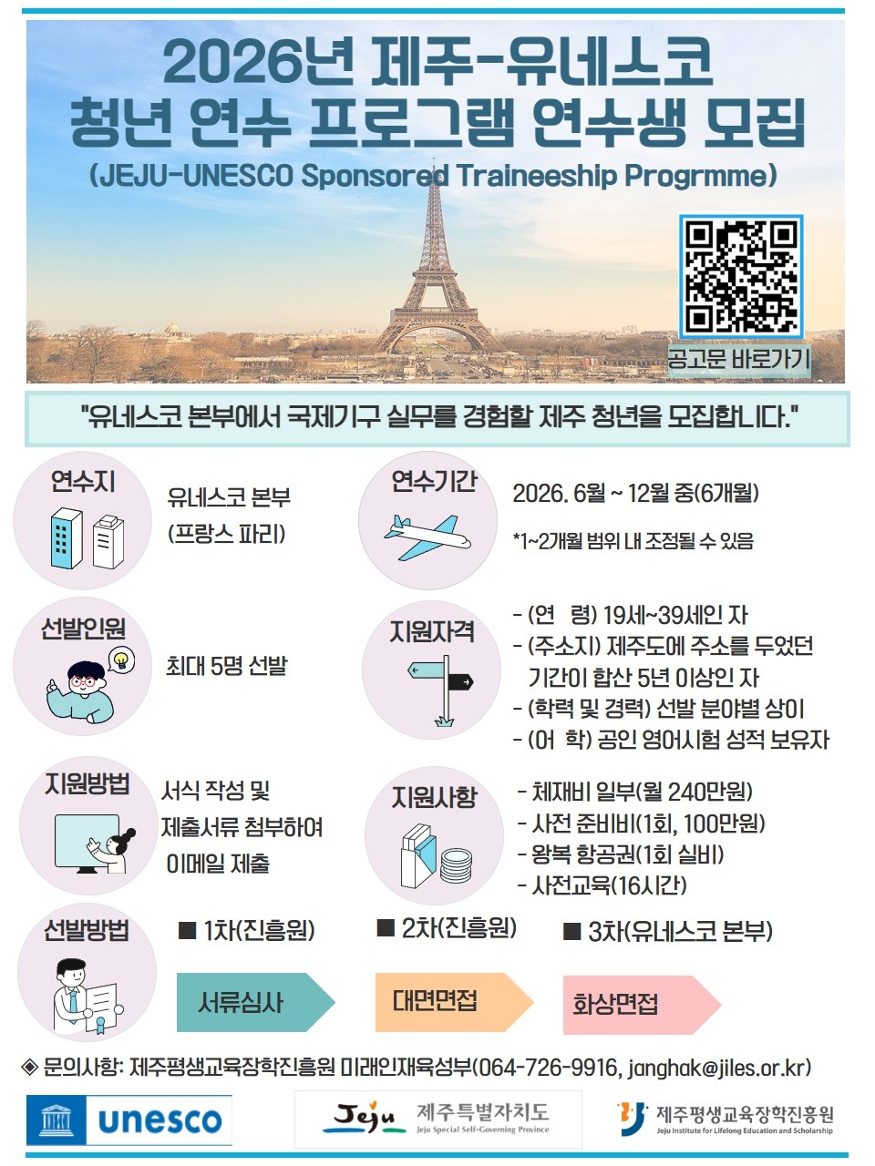Á¦ÁÖÆ¯º°ÀÚÄ¡µµÃ»¿¡¼ Á¦ÁÖ Ã»³âµéÀÌ À¯³×½ºÄÚ º»ºÎ¿¡¼ ½Ç¹« °æÇèÀ» ÅëÇØ ±¹Á¦ Àü¹®°¡·Î ¼ºÀåÇϰí, ³ª¾Æ°¡ ±¹Á¦±â±¸ ÁøÃâÀ» ÁغñÇÒ ¼ö ÀÖµµ·Ï Áö¿øÇÏ´Â '2026³â Á¦ÁÖ-À¯³×½ºÄÚ Ã»³â ¿¬¼ö ÇÁ·Î±×·¥'¿¡ Âü¿©ÇÒ Âü°¡ÀÚ¸¦ ¾Æ·¡¿Í °°ÀÌ ¸ðÁýÇÏ¿À´Ï ¸¹Àº °ü½É°ú Âü¿© ºÎʵ右´Ï´Ù.